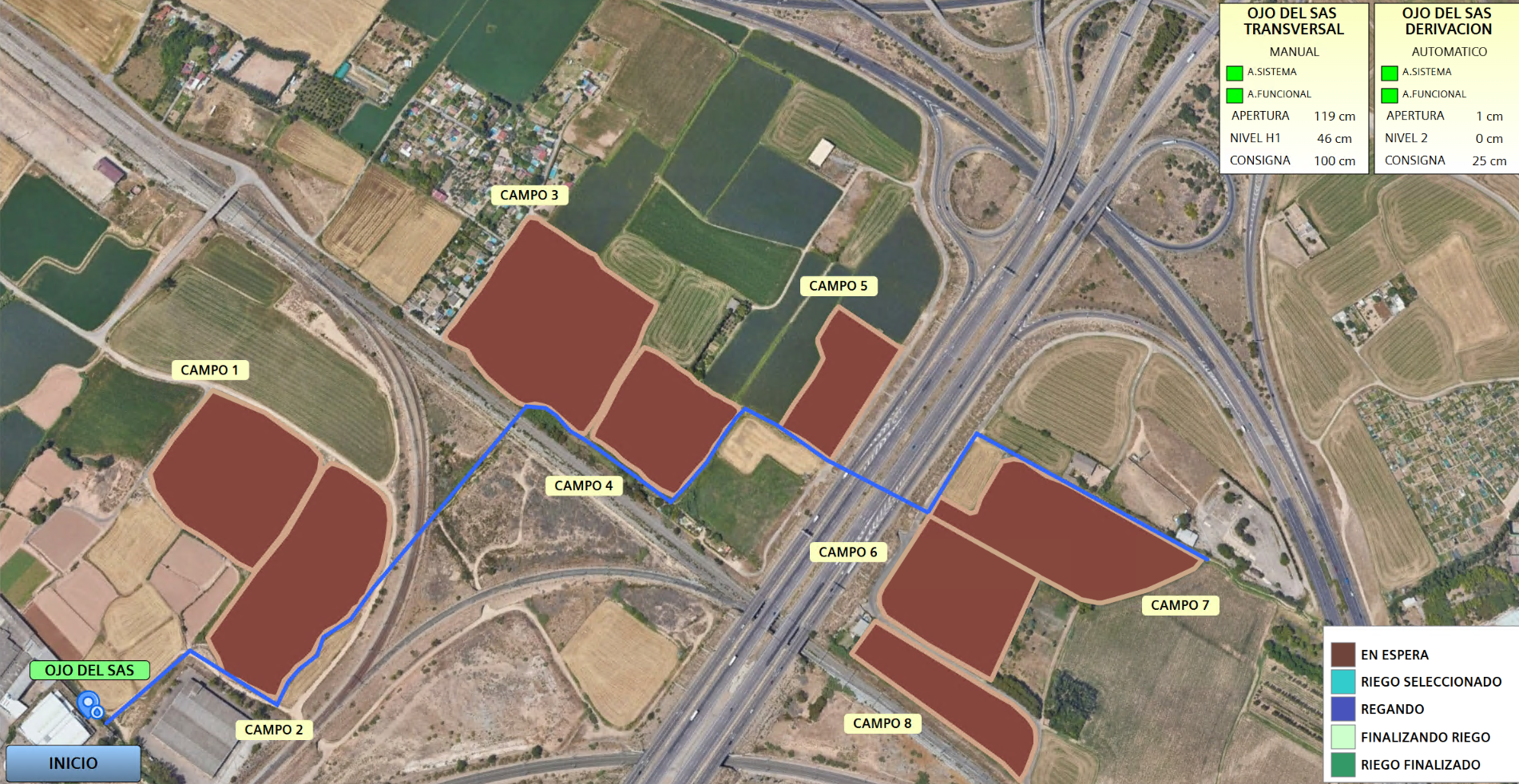 Monitorización continua de niveles de agua, flujos y estado de compuertas.